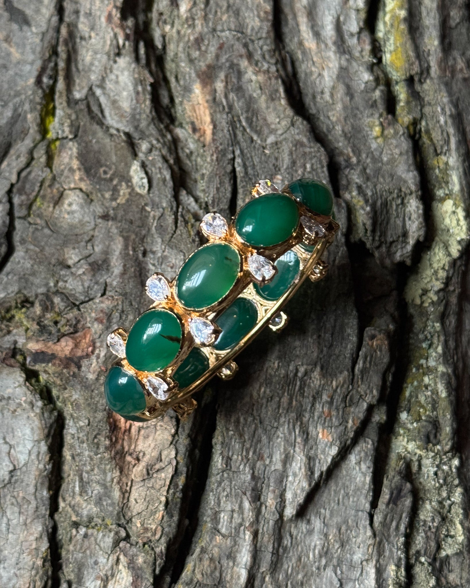 A festive statement piece featuring a polished oval agate stone, available in blue and green. Handcrafted in gold-plated brass, this cuff adds a touch of bold elegance to any celebration look.