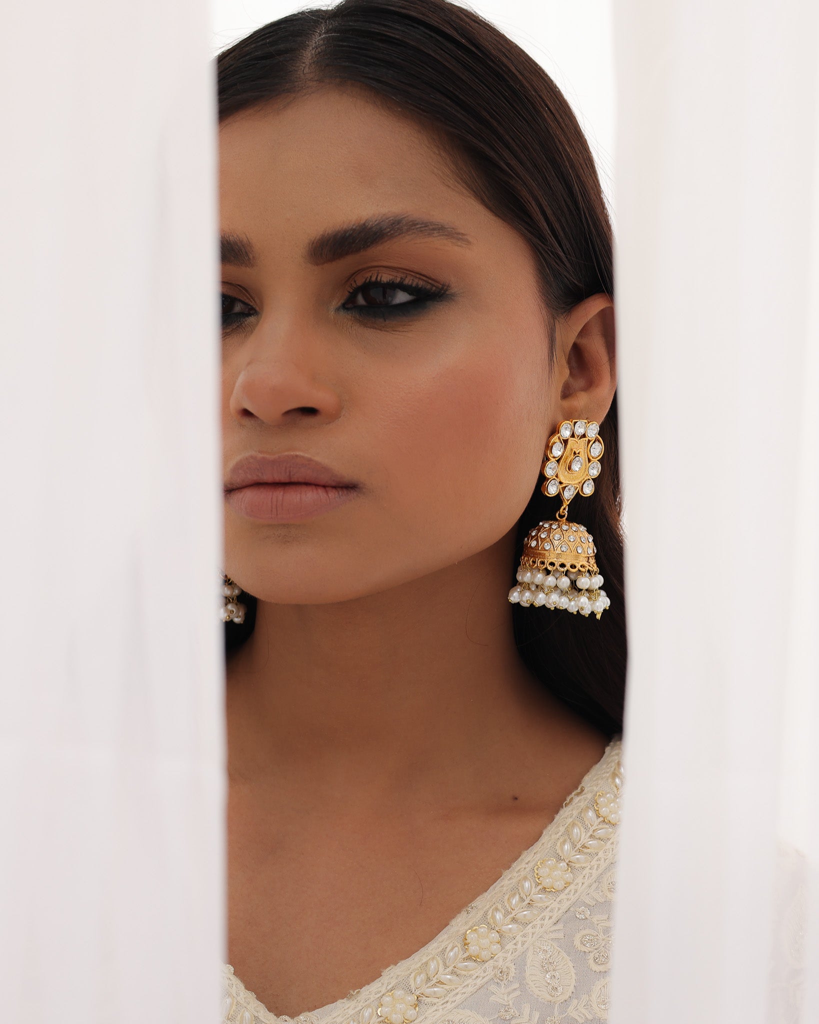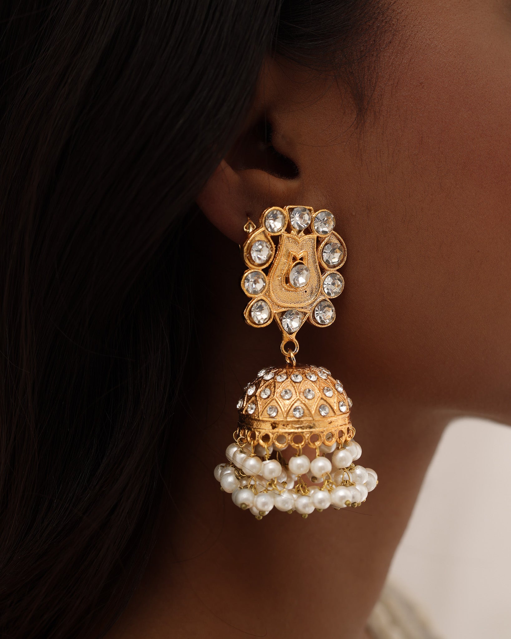 Jhumke handcrafted in gold plated brass, encrusted with sparkling zircons and pearls hangings