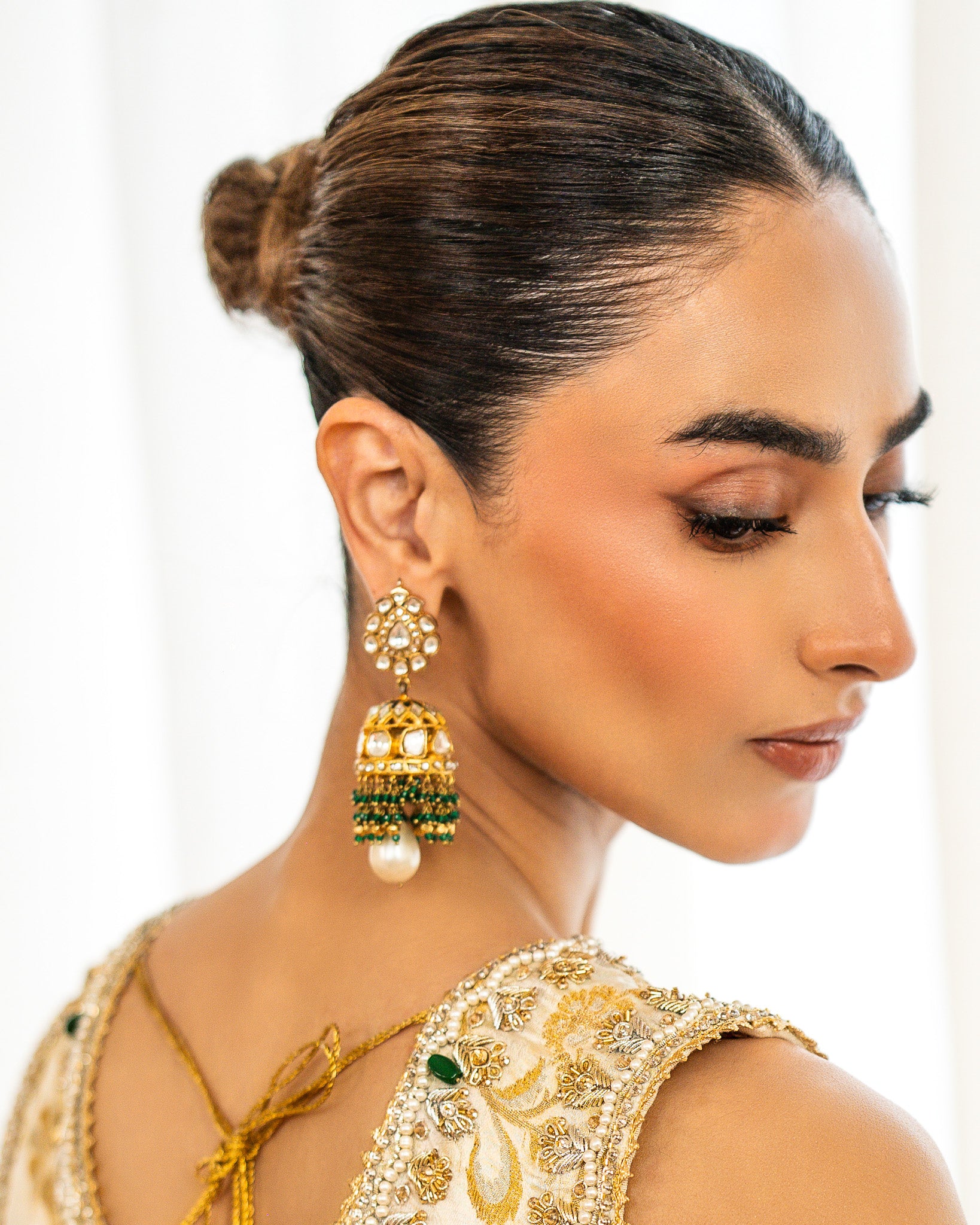 A handcrafted stone Polki choker and matching jhumkas with faux pearl and emerald hangings. Made in gold-plated brass, perfect for weddings and celebrations.
