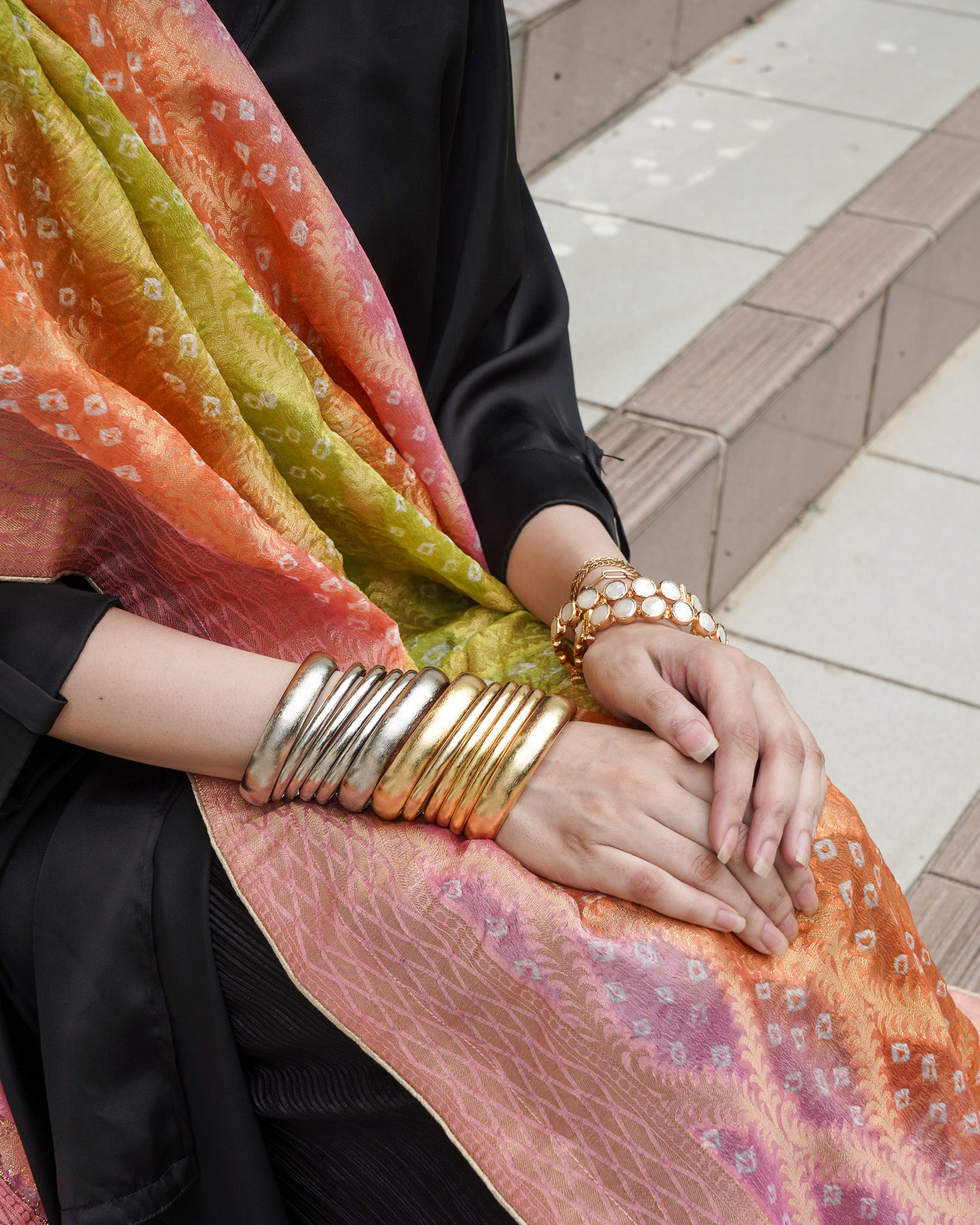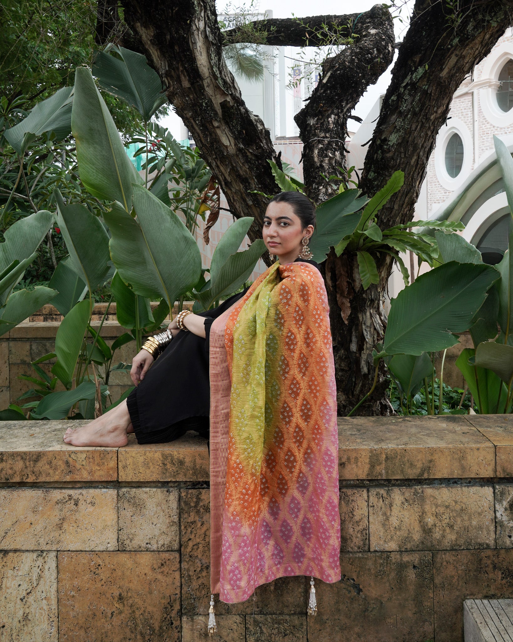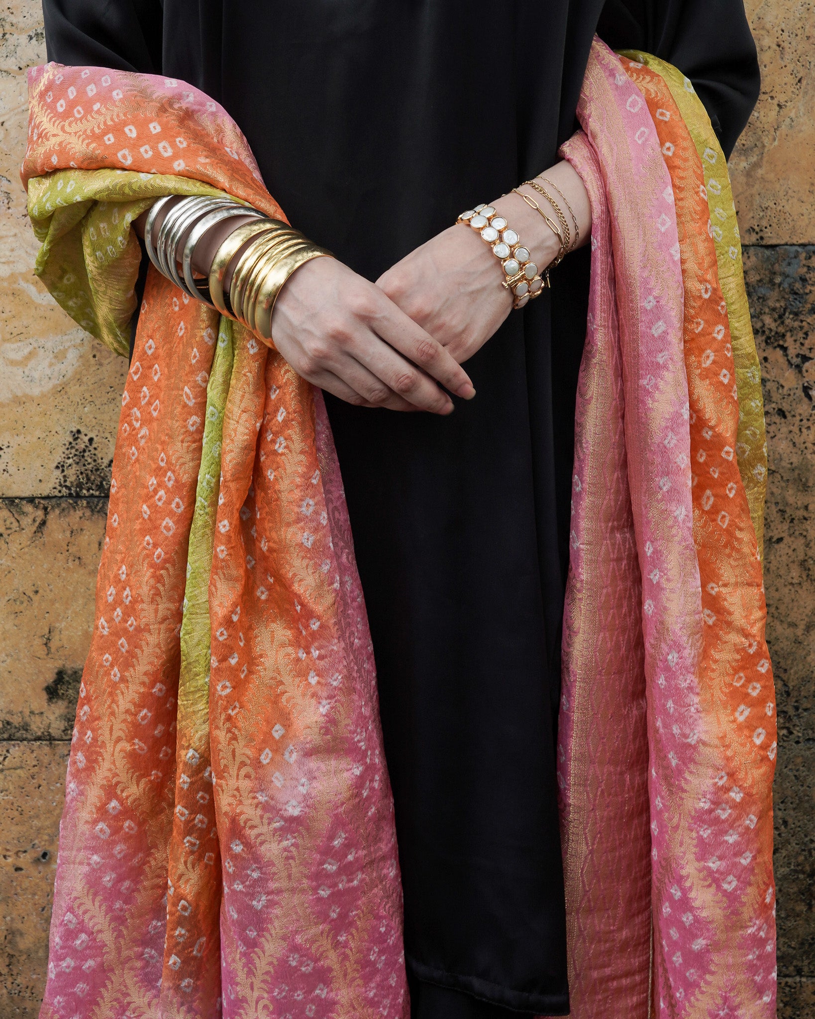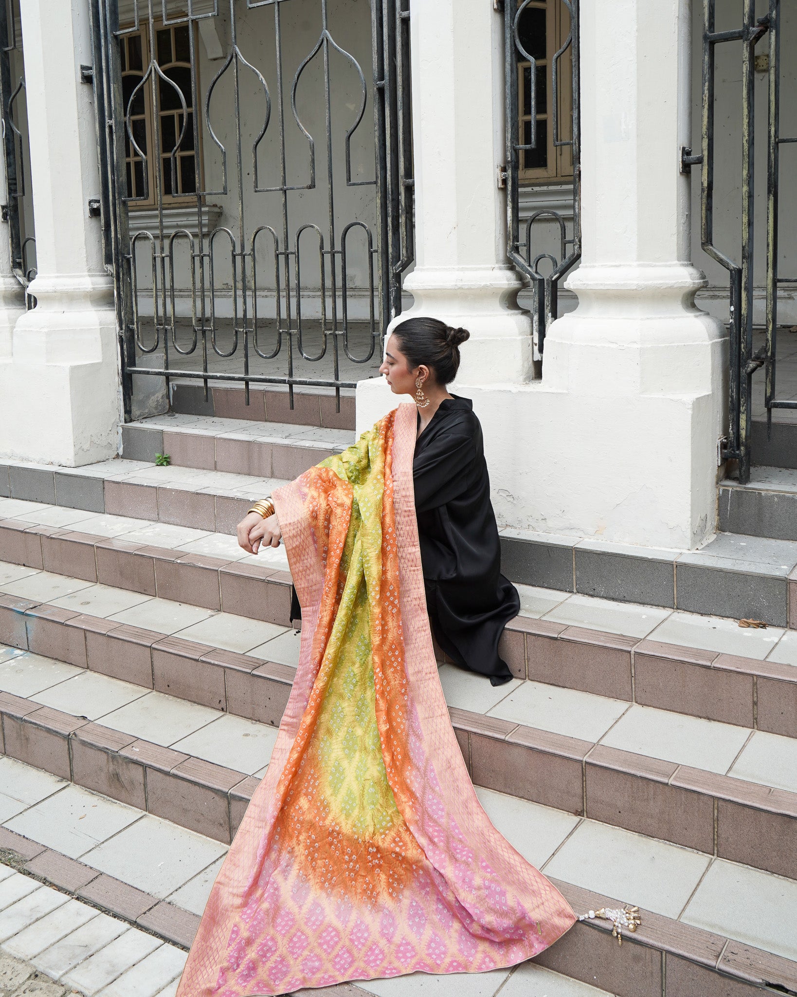 A burst of colour in mint, orange and pink the Neem Zari chiffon dupatta is adorned with delicate bandhani detailing and finished with a gold-edged border. The look is completed with bespoke handmade tassels and a signature ShehNoor metal tag.