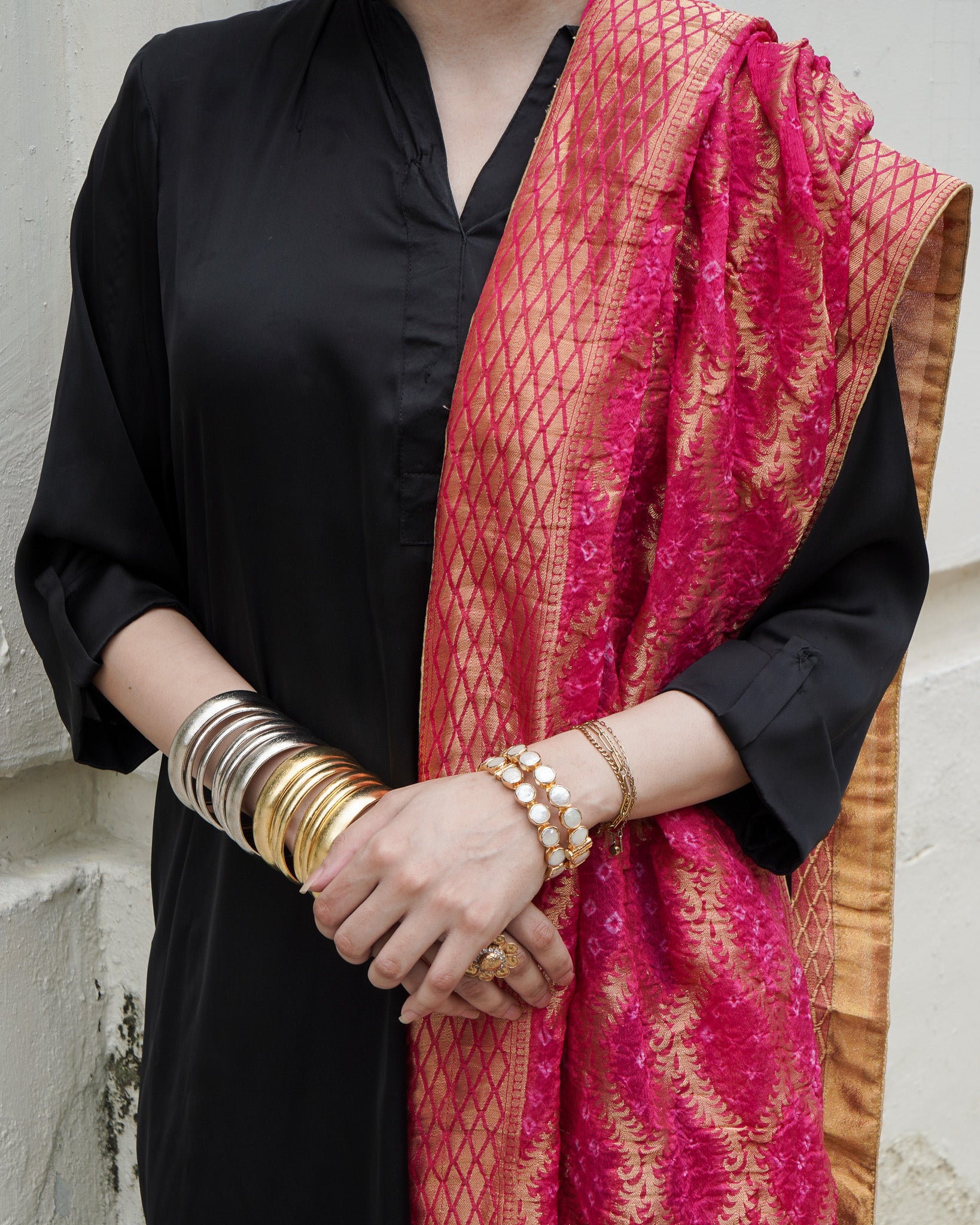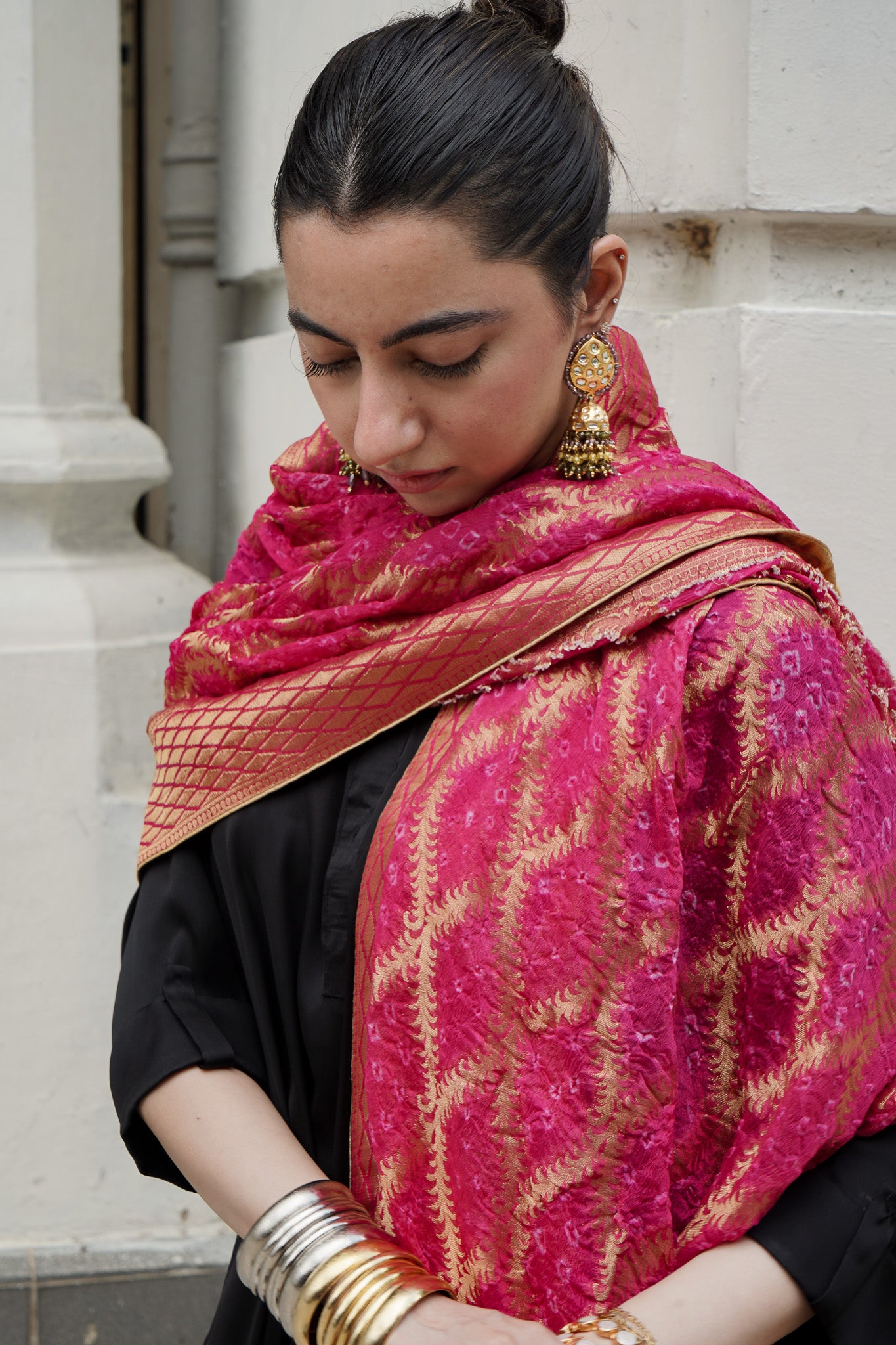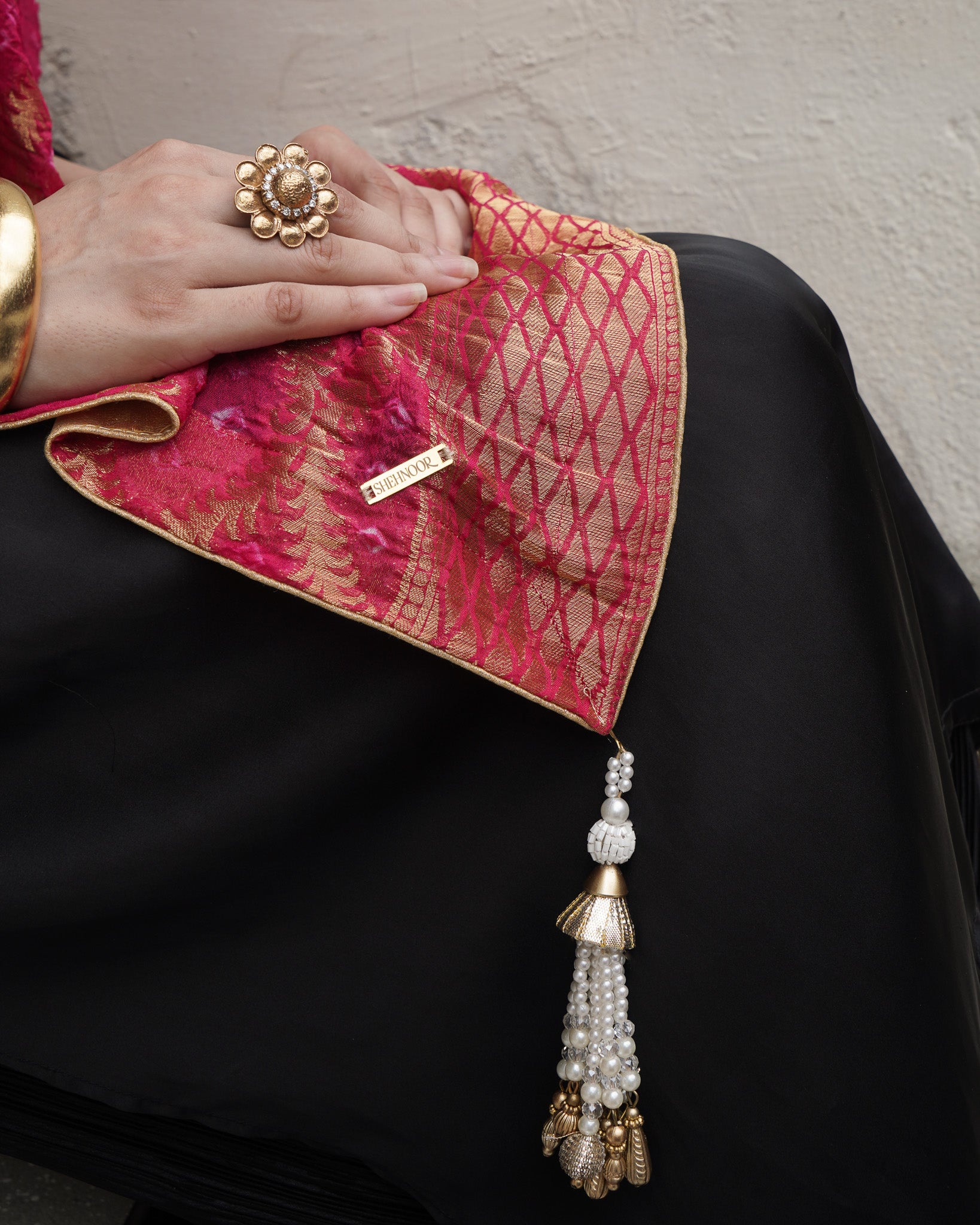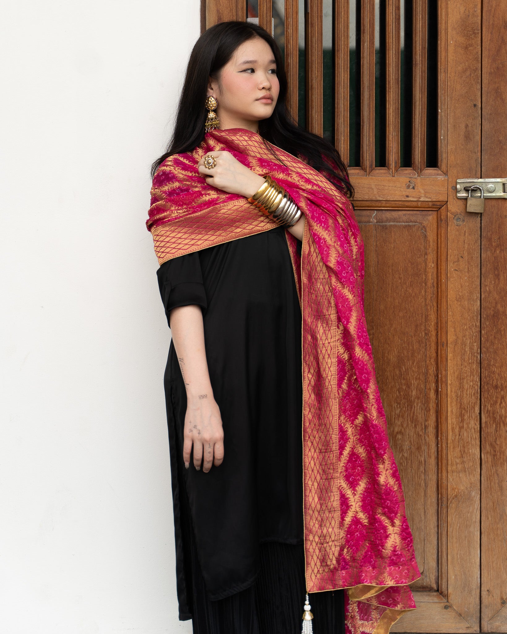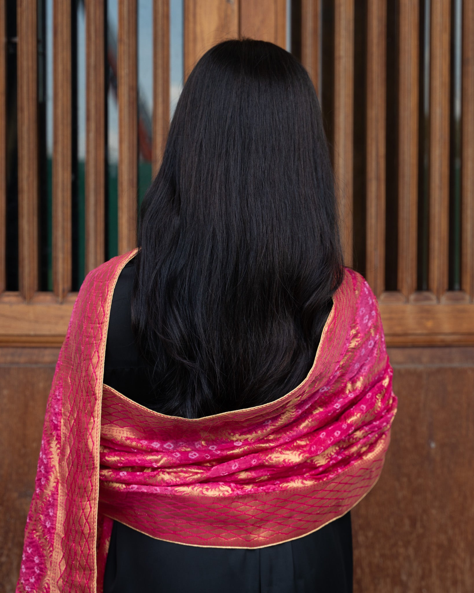 A vibrant Neem Zari chiffon dupatta in bright pink, detailed with traditional bandhani and finished with a gold-edged border. The look is completed with bespoke handmade tassels and a signature ShehNoor metal tag.