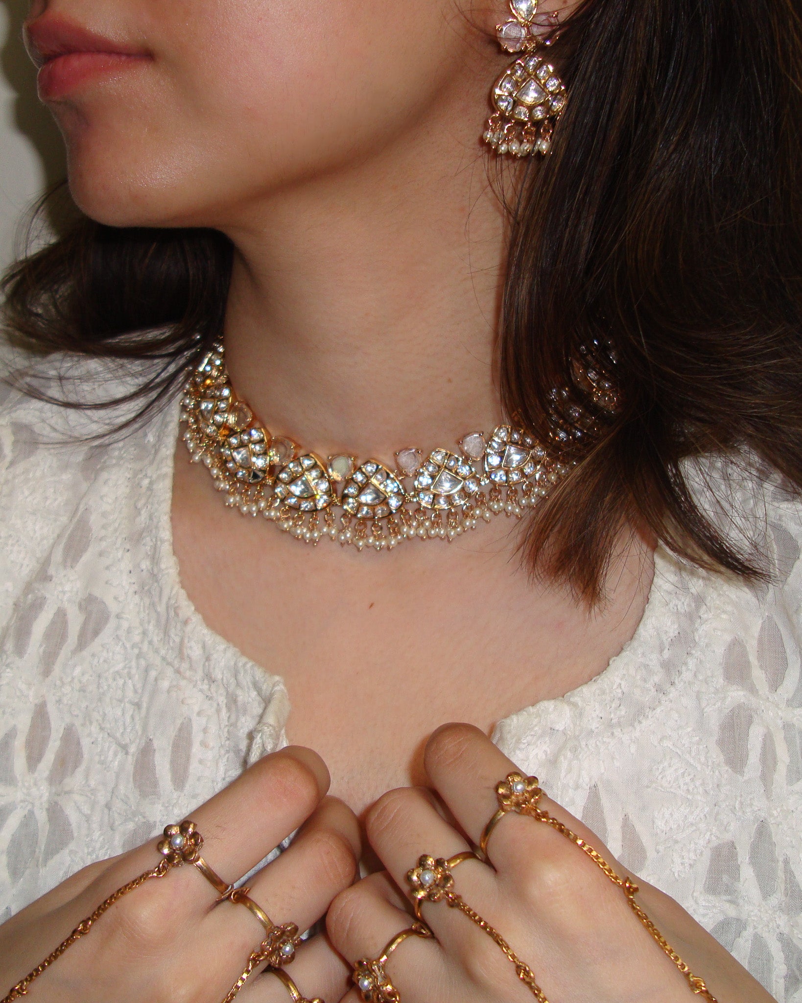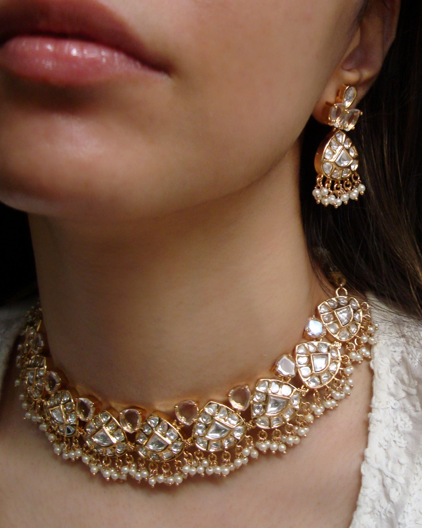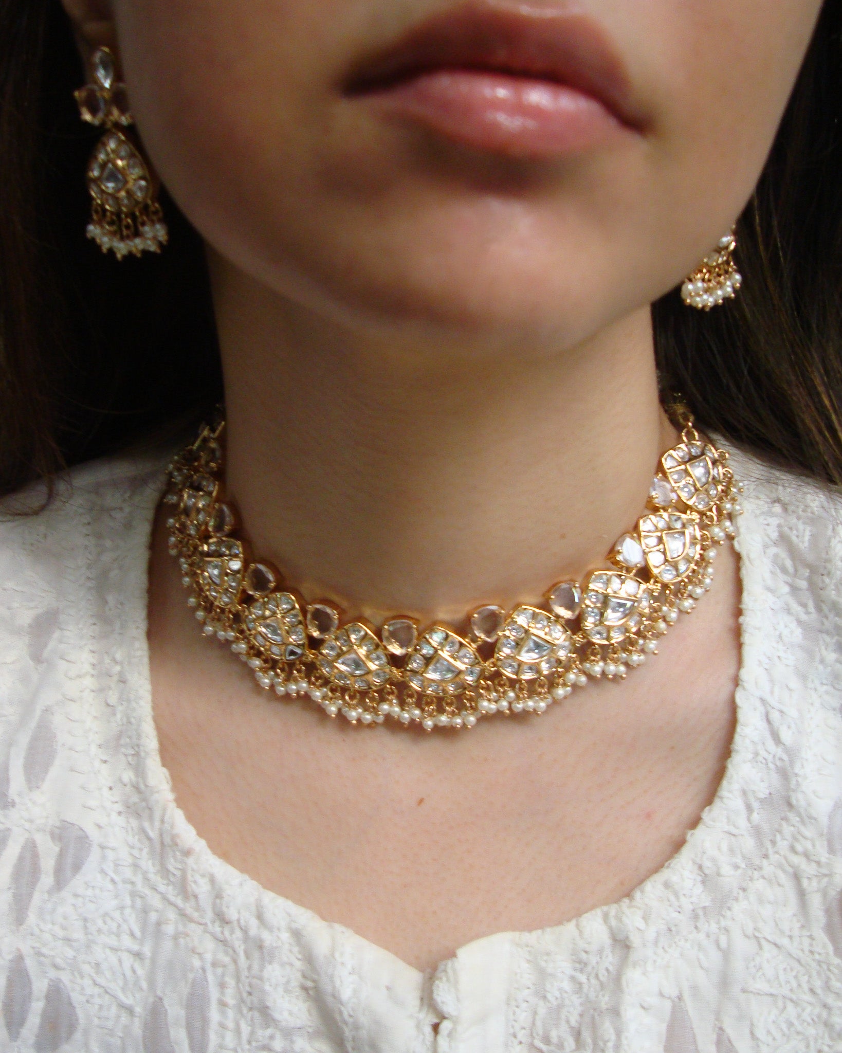 A one-of-a-kind necklace and earring set handcrafted with Kundan and clear crystals perfect for a wedding, festive occasion, or a glamorous night out