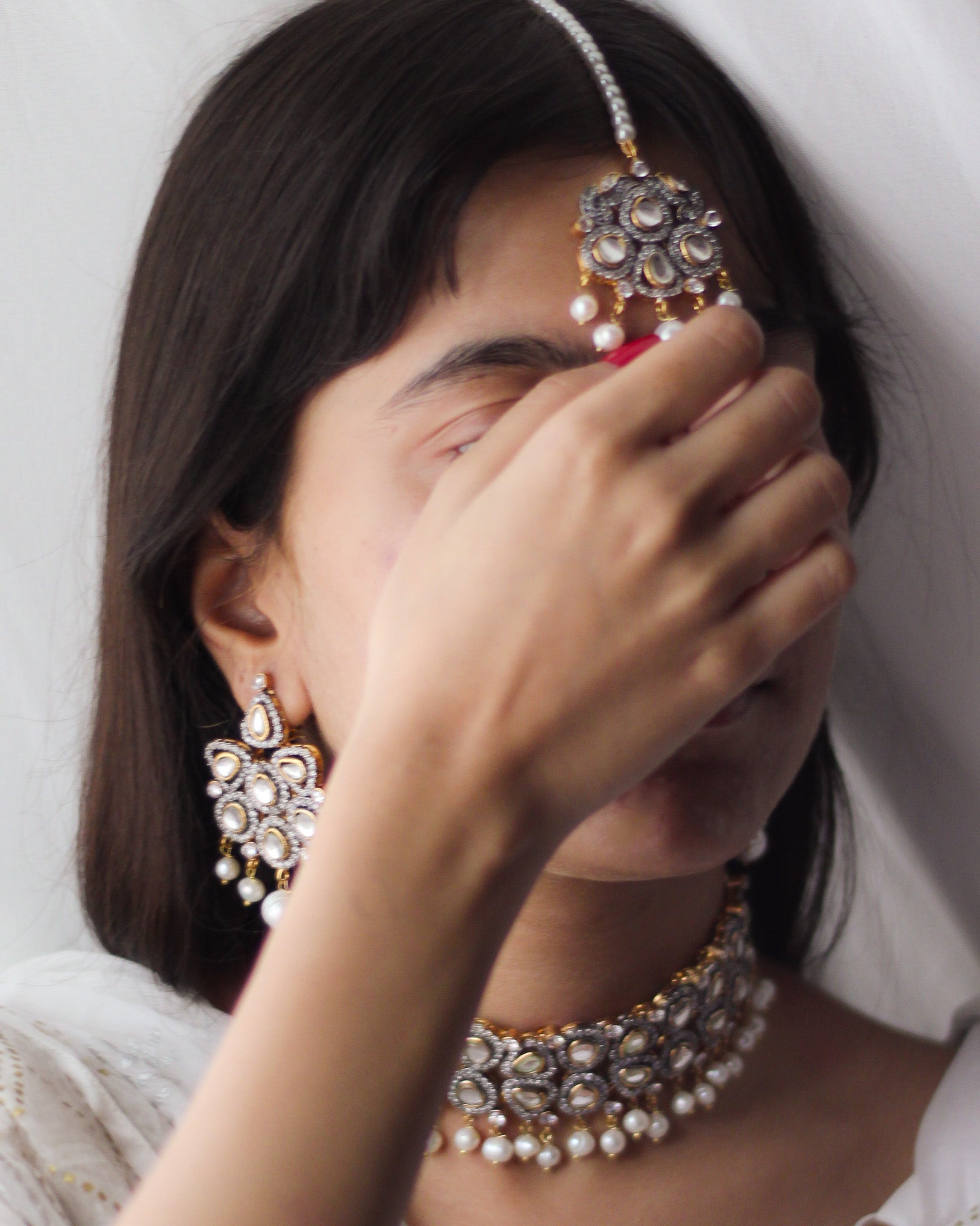 Two-toned polki choker crafted in gold plated brass, adorned with handset zirconia and finished with freshwater pearls. To be paired with matching tikka and earrings.