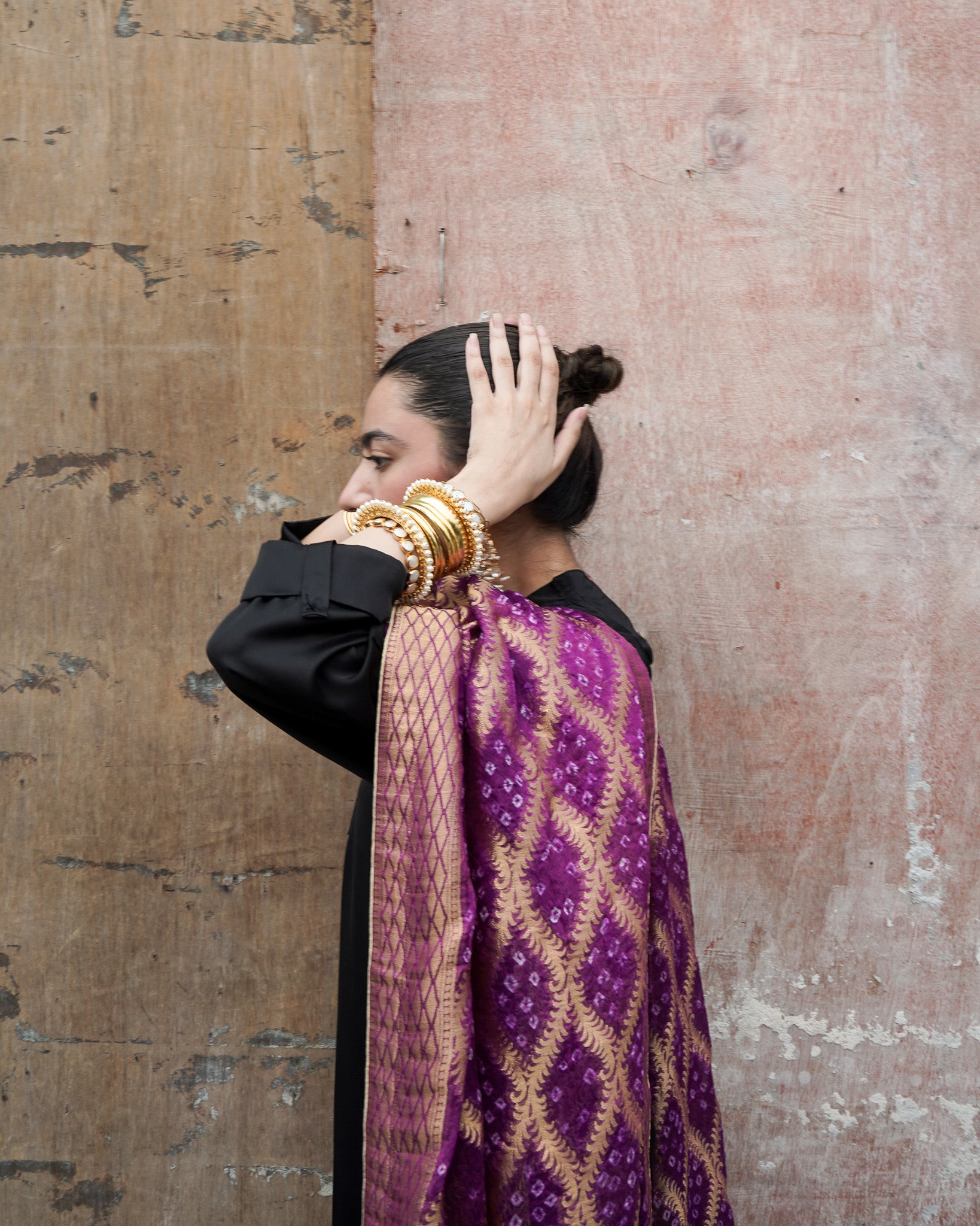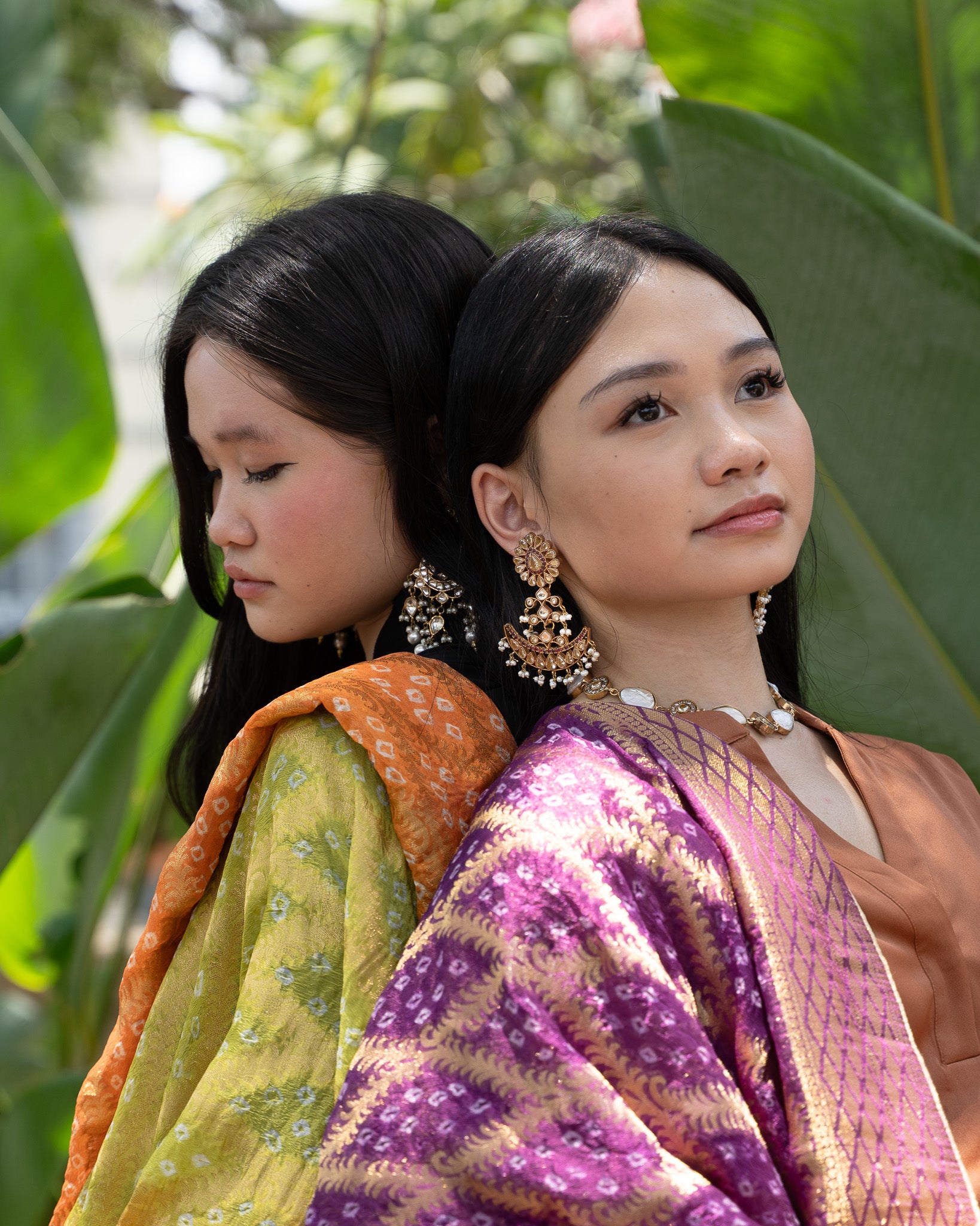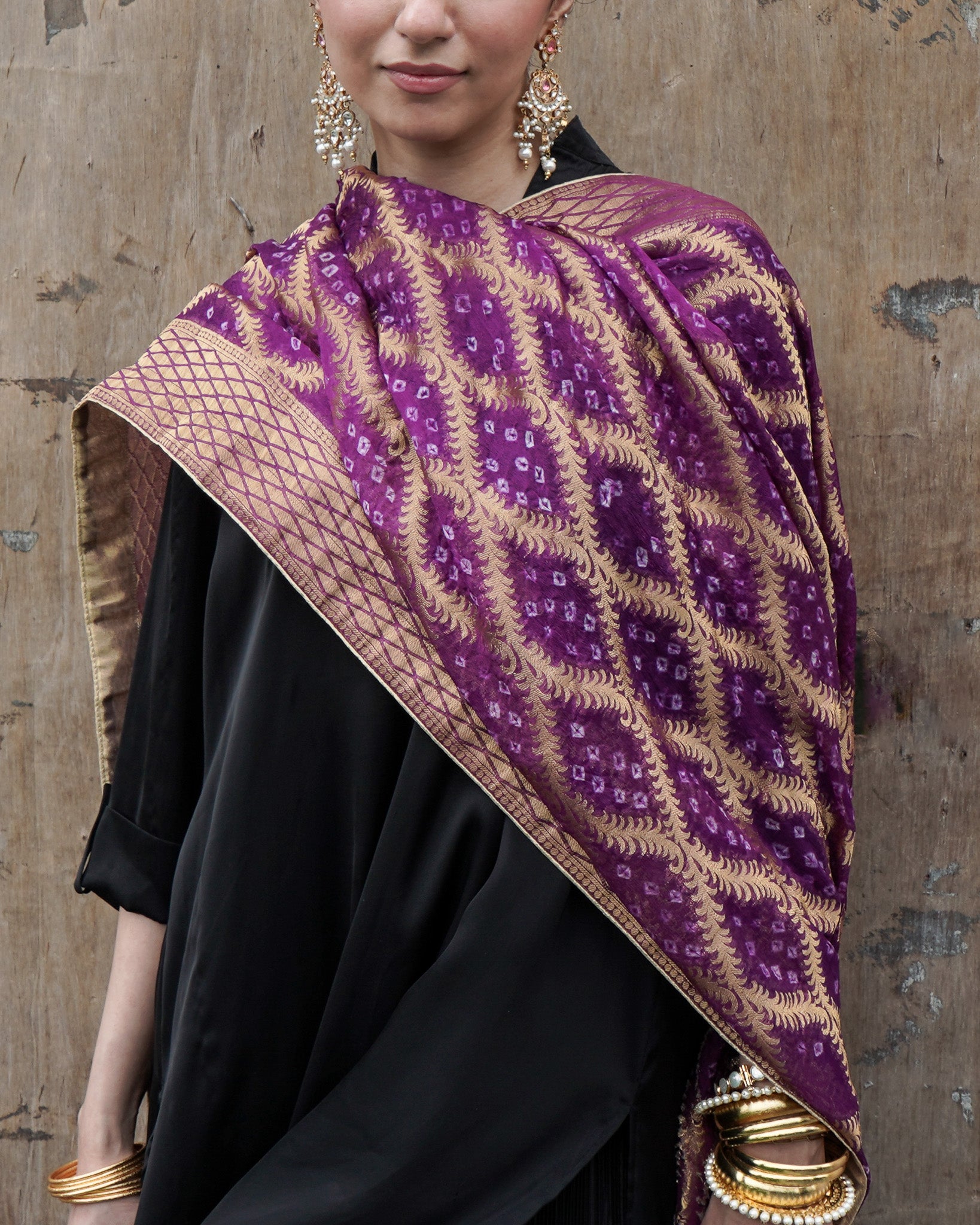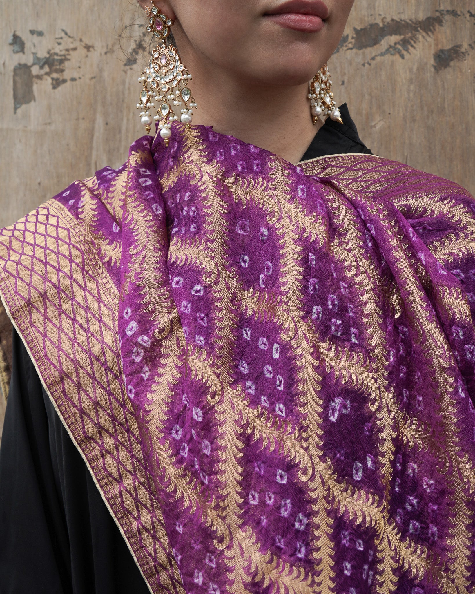 A regal Neem Zari chiffon dupatta in deep purple, adorned with delicate bandhani detailing and finished with a gold-edged border. The look is completed with bespoke handmade tassels and a signature ShehNoor metal tag.