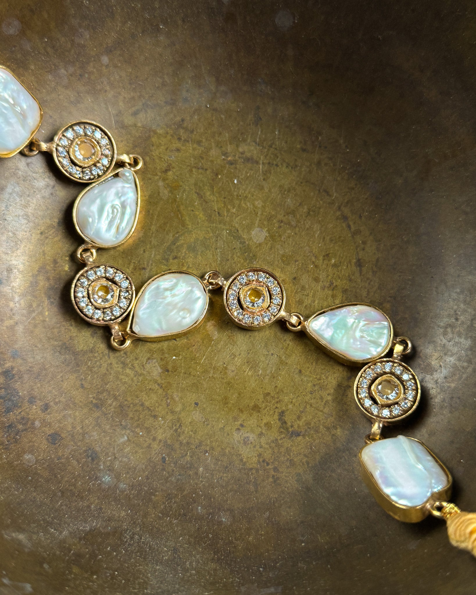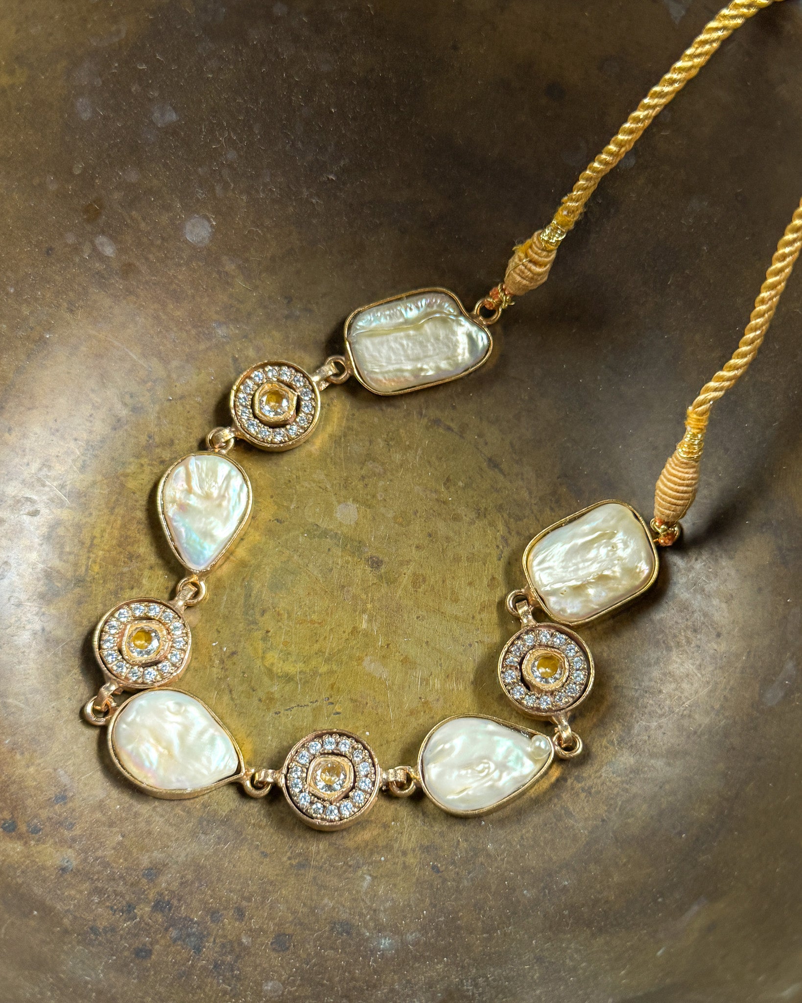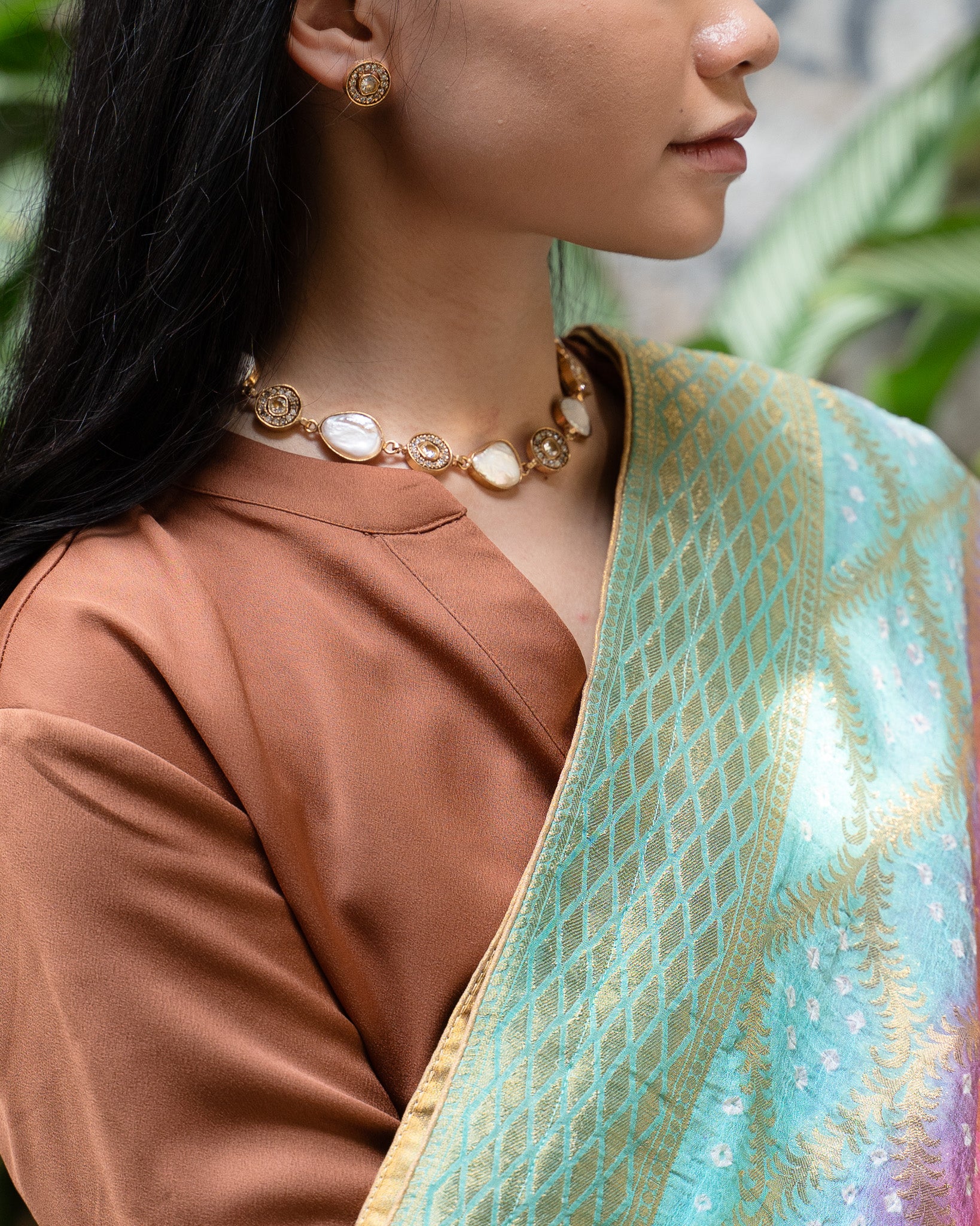 Gold-plated choker encrusted with sparkling zircons and freshwater pearls. Paired with matching studs to complete the look elegant, timeless, and perfect for festive occasions.