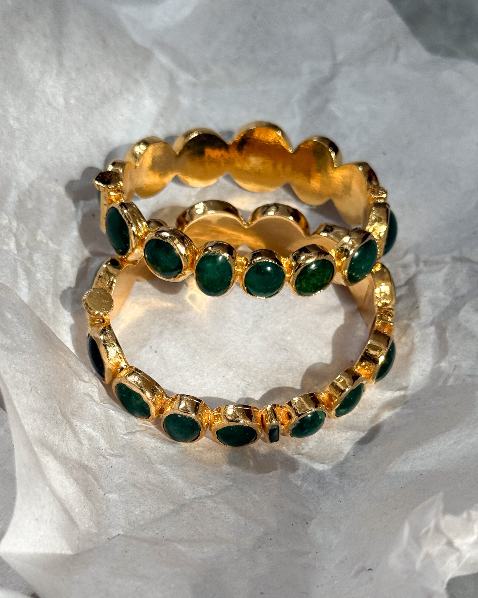 Chunky, stackable cuffs handcrafted in gold plated brass, featuring circular emerald stones. Perfect for layering or making a statement on their own.