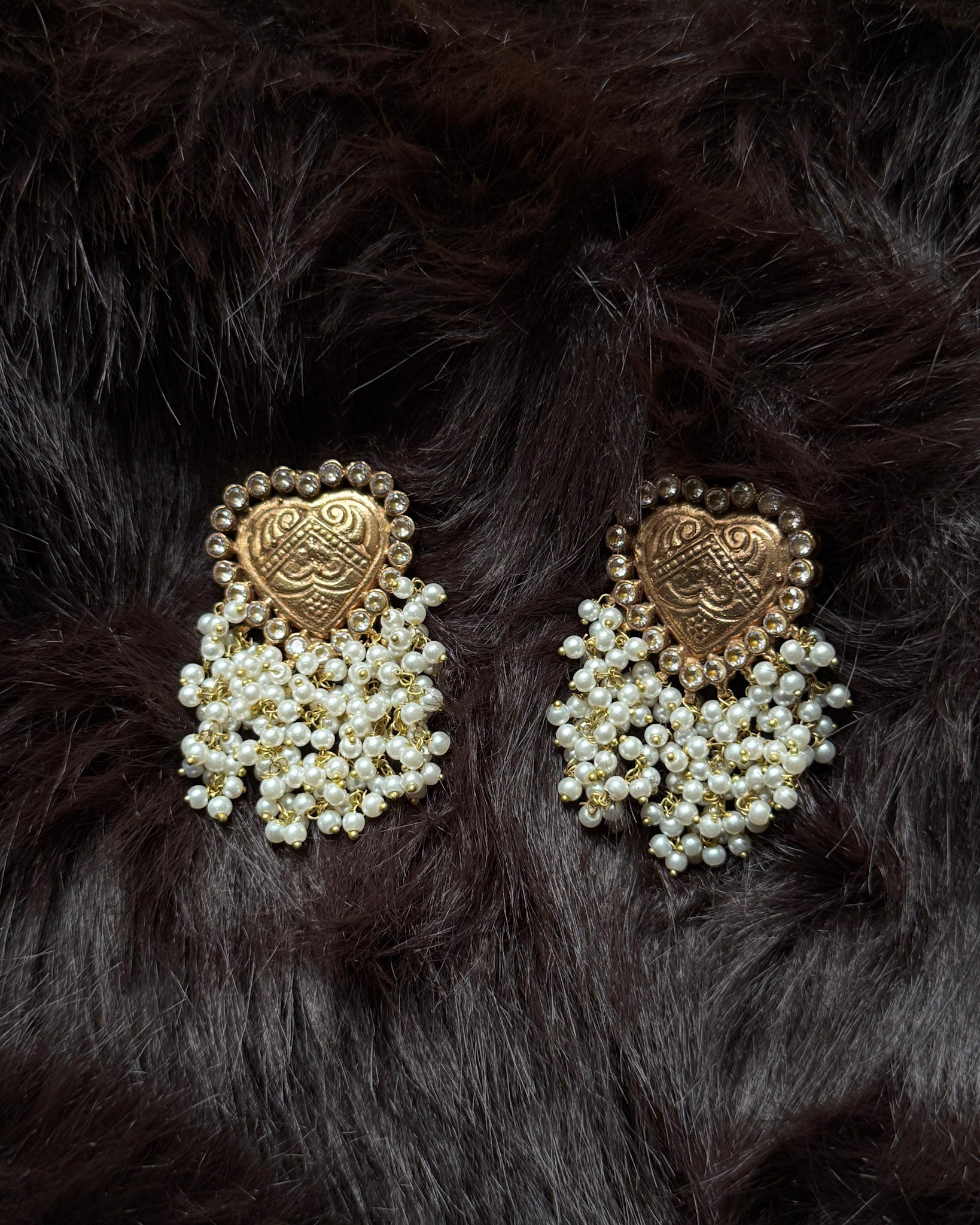 Heart-shaped statement earrings featuring intricate Mughal-inspired engraving, framed with zircon detailing and finished with pearl cluster hangings.