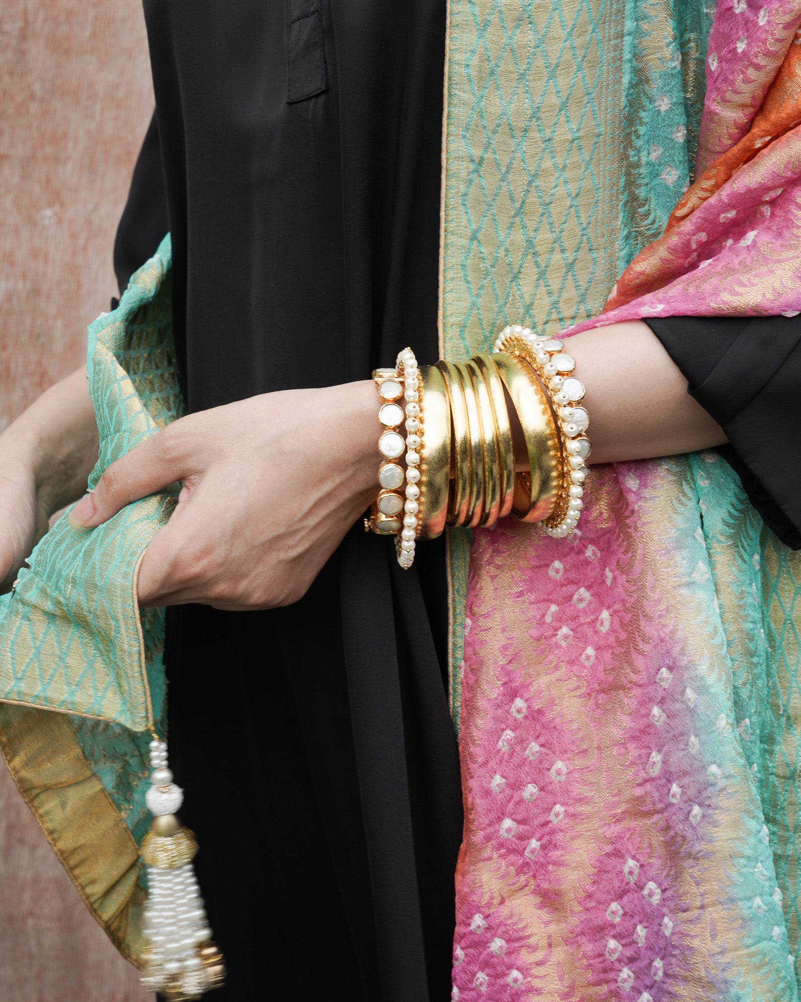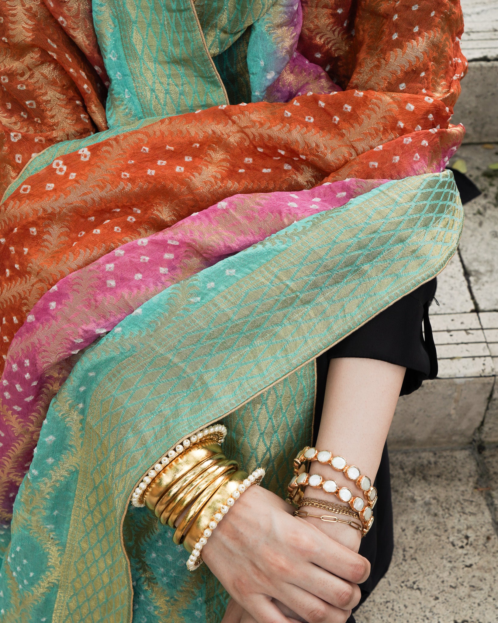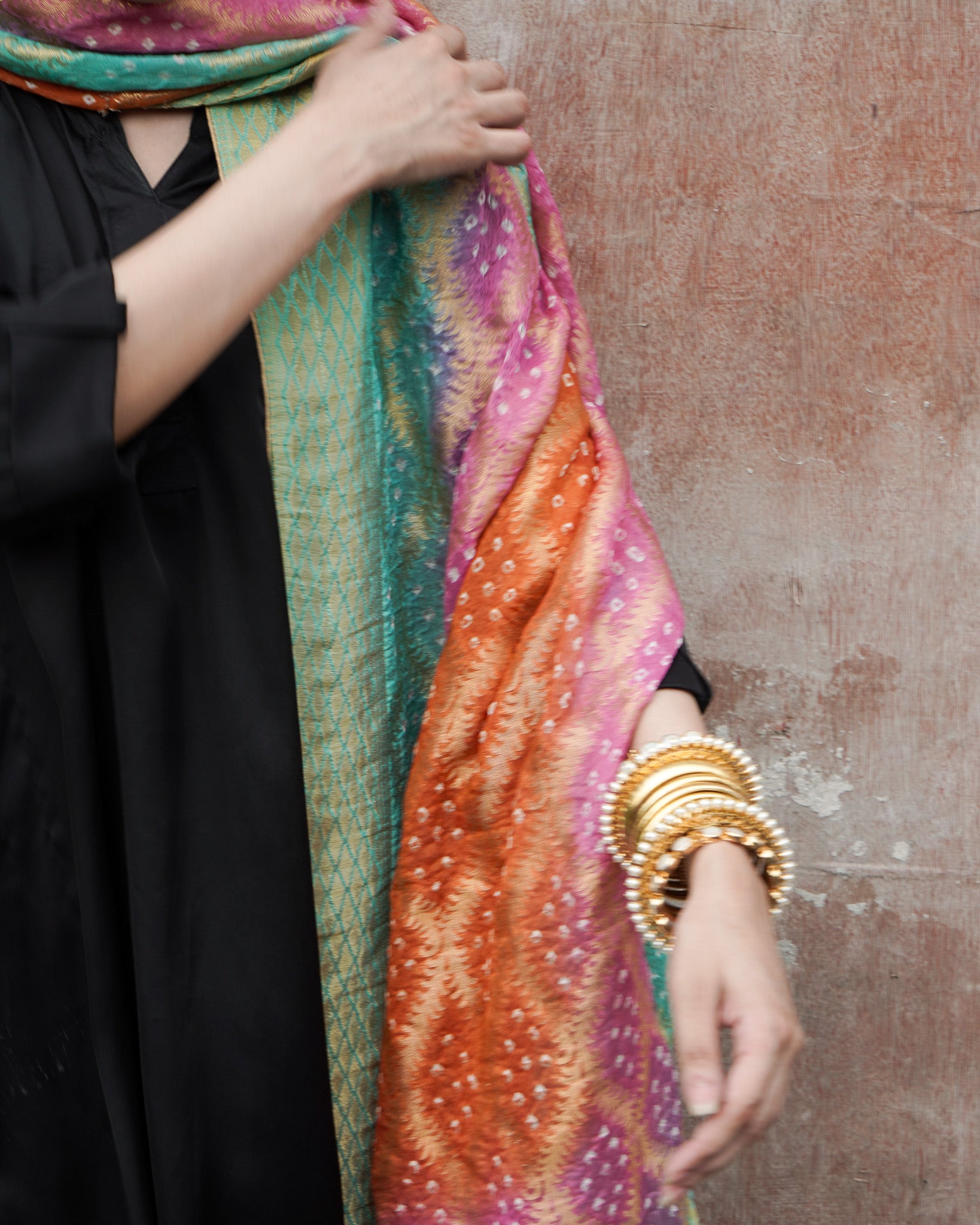 A burst of festive colour in burnt orange, bright pink, and ferozi, the Neem Zari chiffon dupatta is adorned with delicate bandhani detailing and finished with a gold-edged border. The look is completed with bespoke handmade tassels and a signature ShehNoor metal tag.