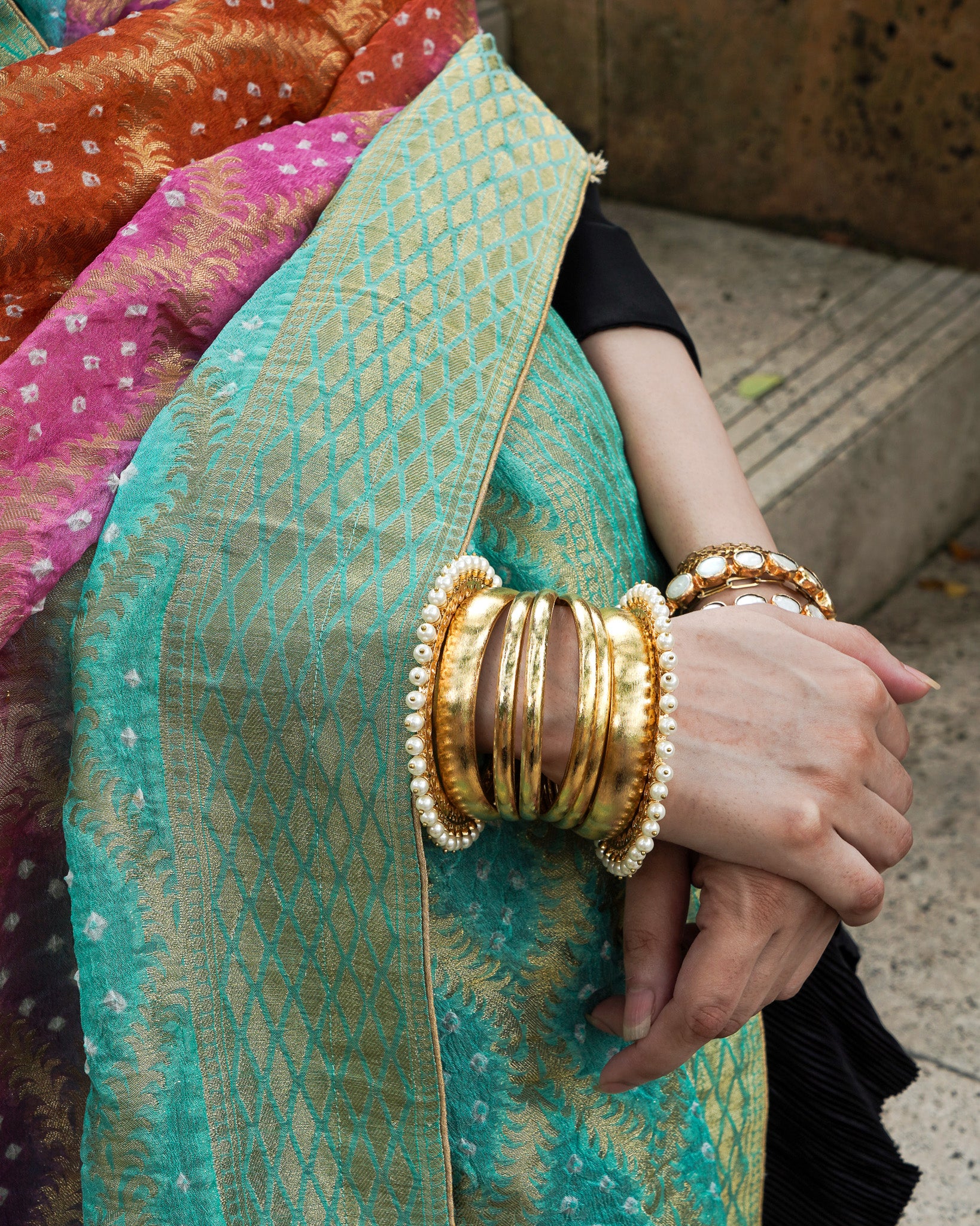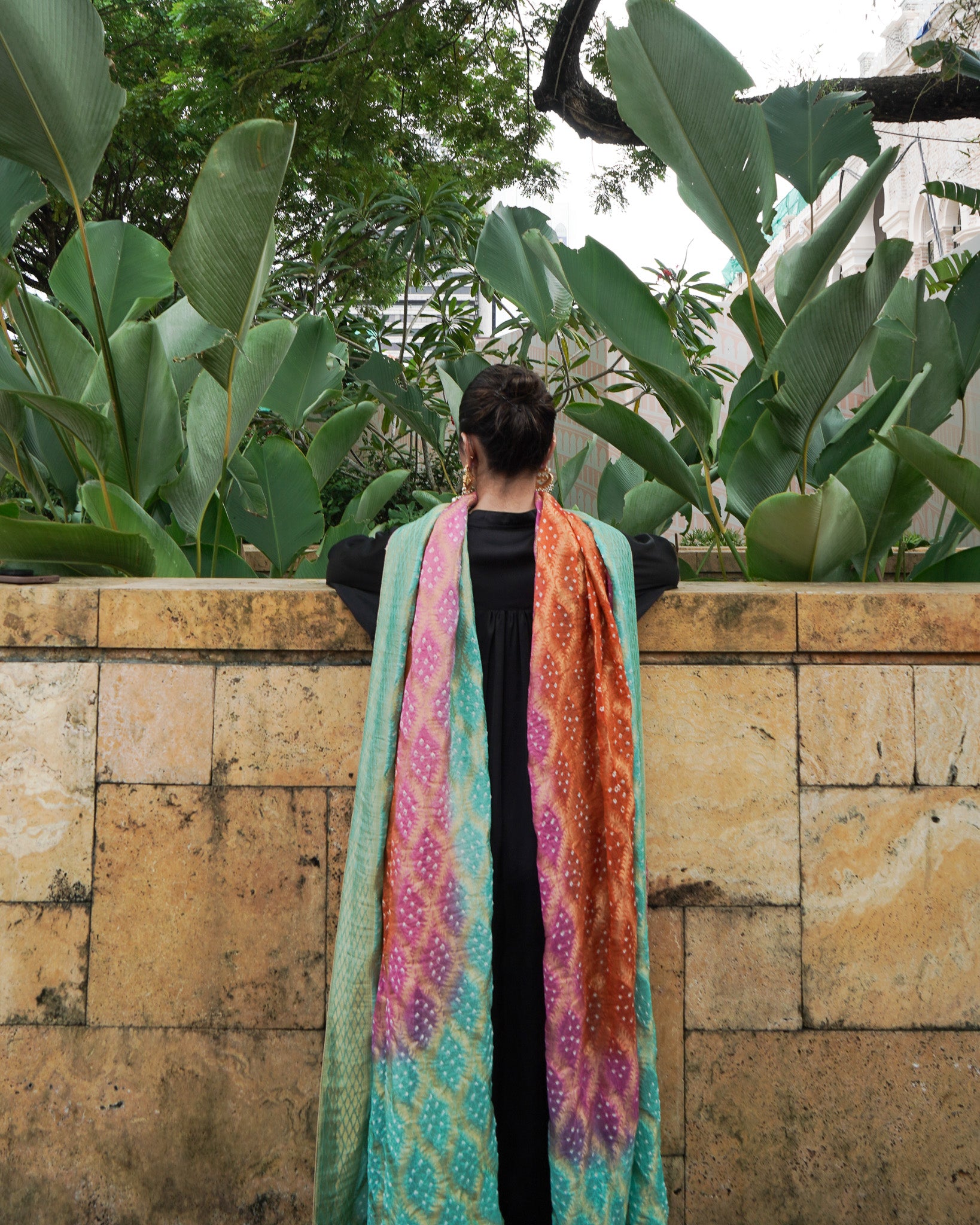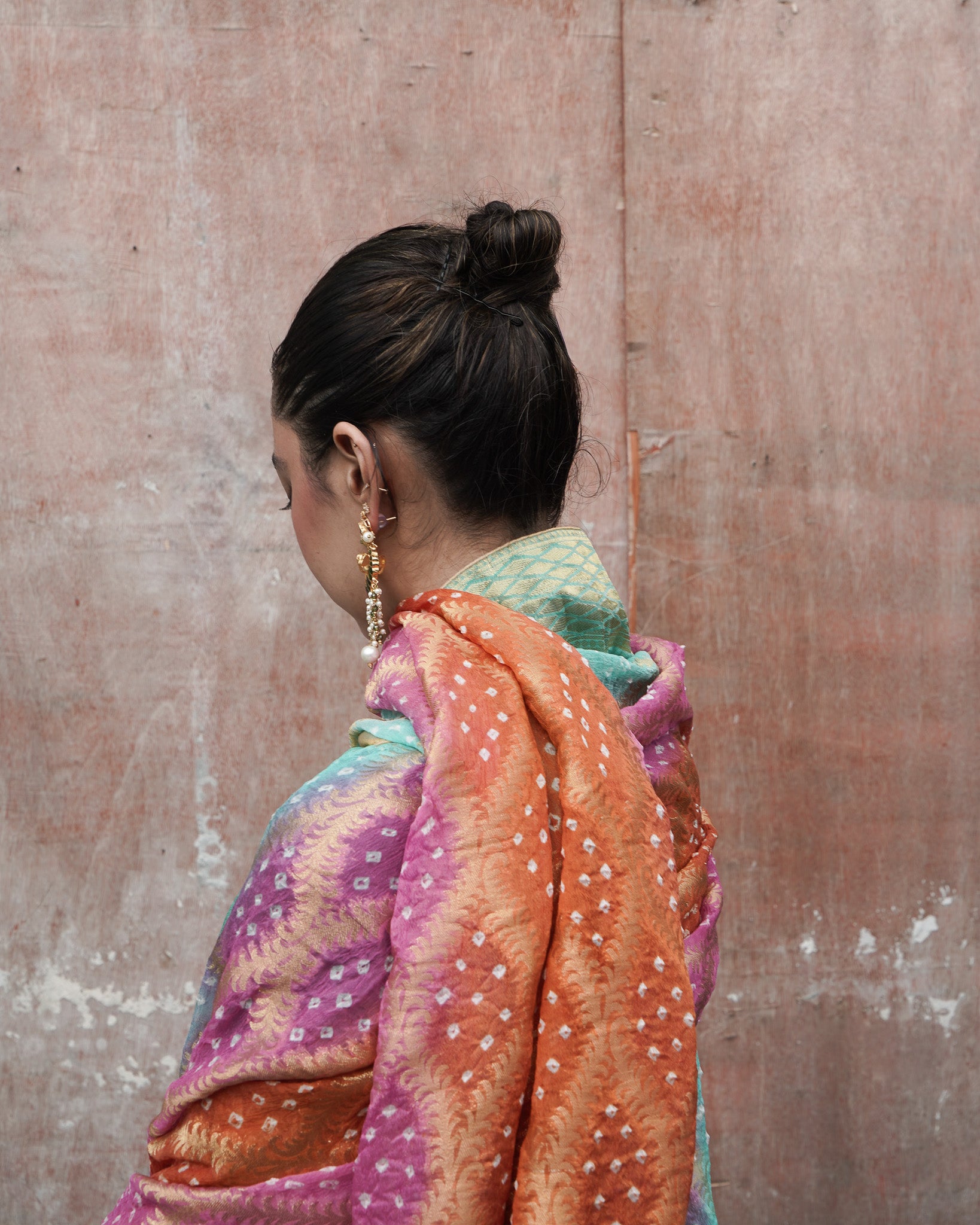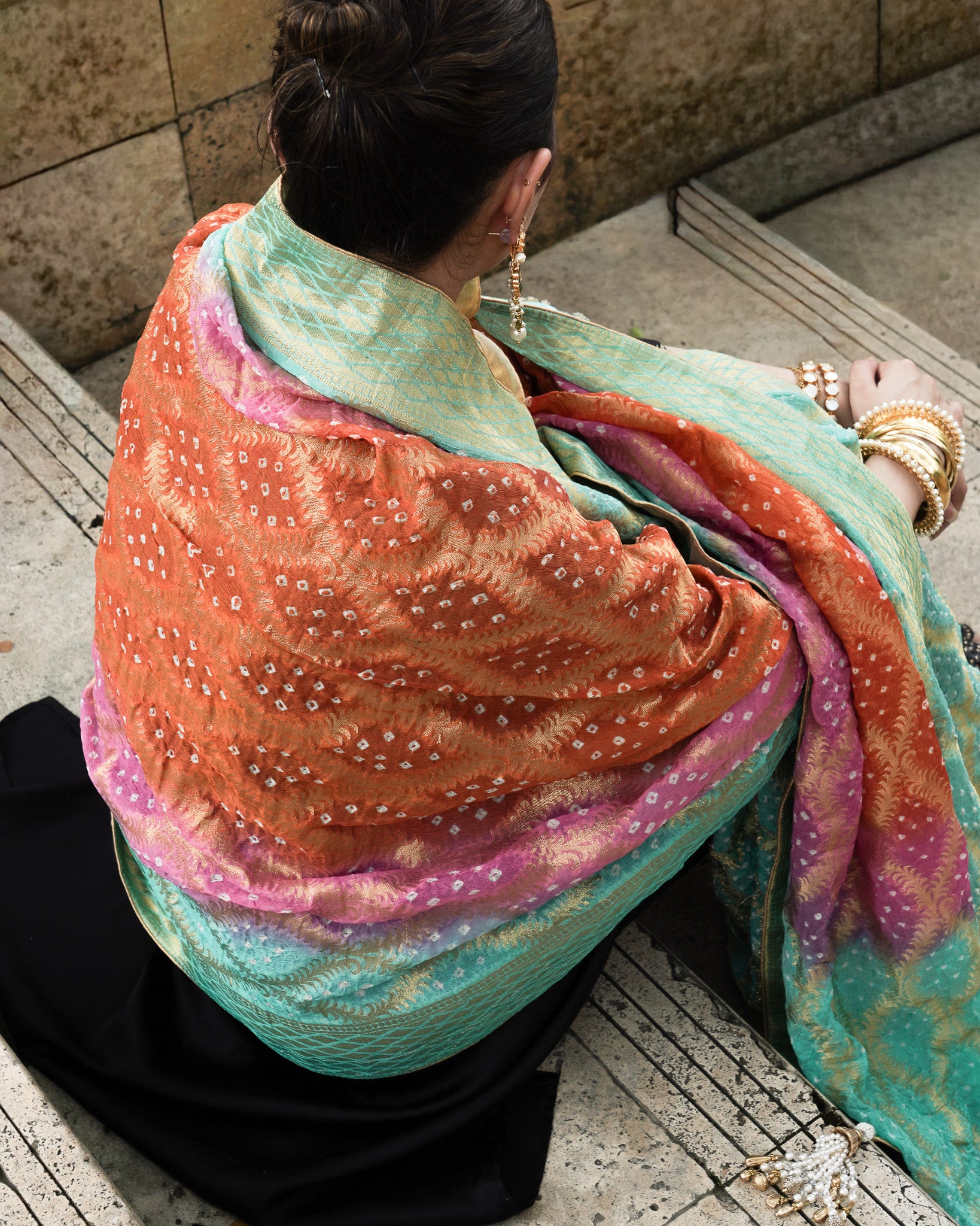A burst of festive colour in burnt orange, bright pink, and ferozi, the Neem Zari chiffon dupatta is adorned with delicate bandhani detailing and finished with a gold-edged border. The look is completed with bespoke handmade tassels and a signature ShehNoor metal tag.