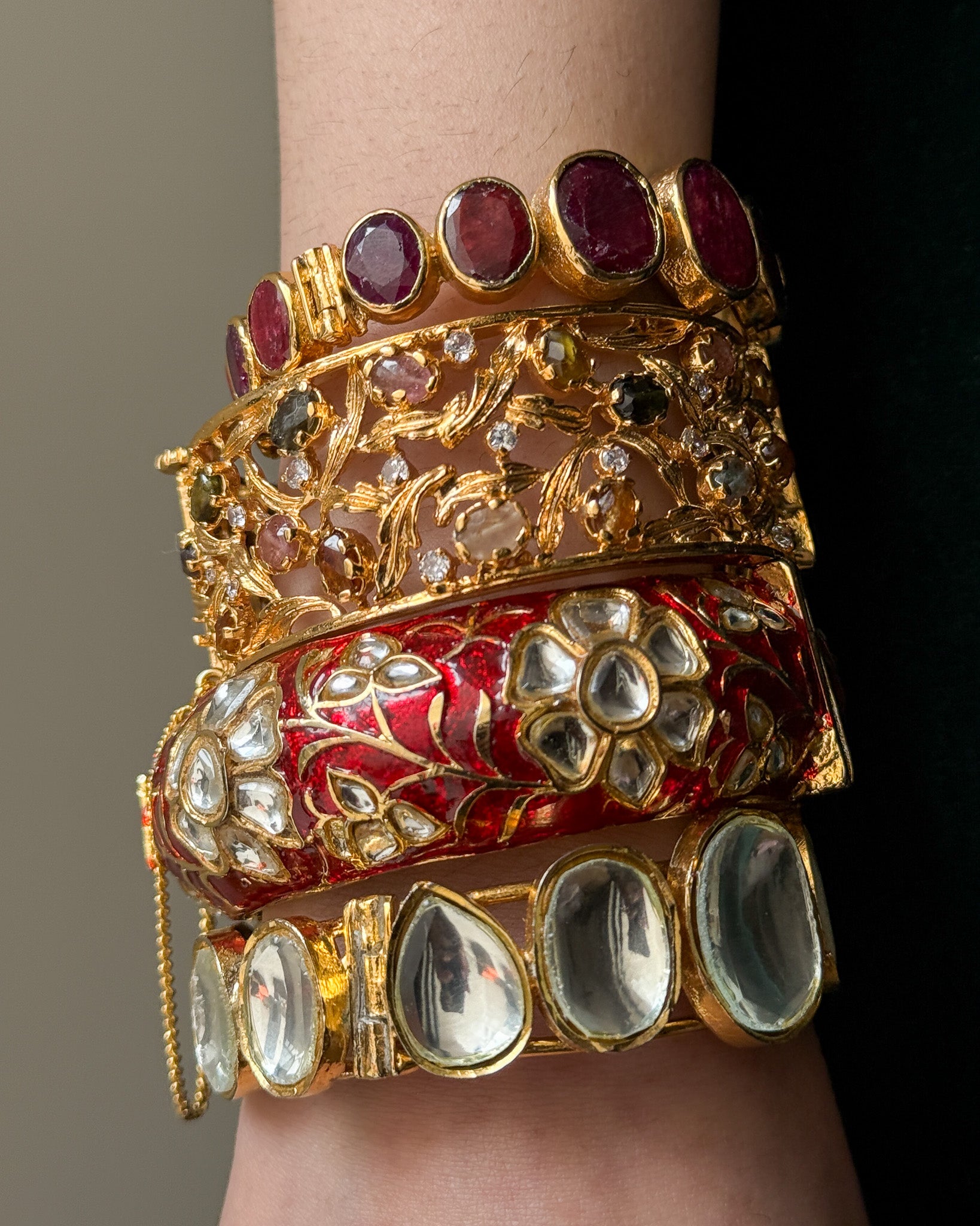 This openable polki karra is a true statement of craftsmanship, featuring delicate hand-painted enamel detailing on both the inside and outside. The outer surface is finished in a rich ruby red, while the inner enamel reveals a pale coral hue that adds an unexpected contrast.