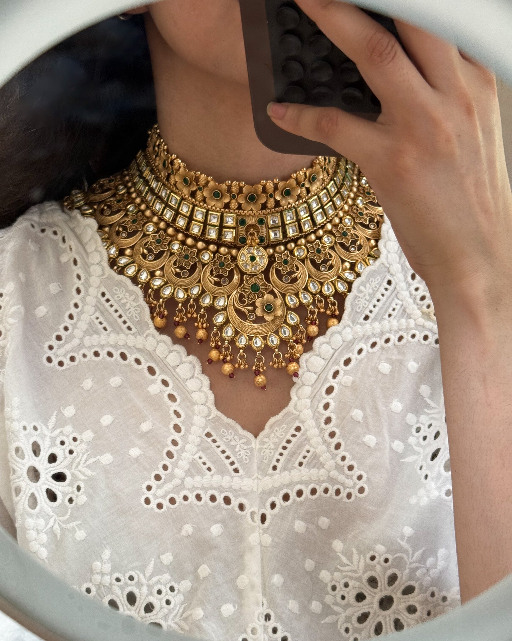A one-of-a-kind gold plated collar choker encrusted with stone polkis, zircons and gold moti