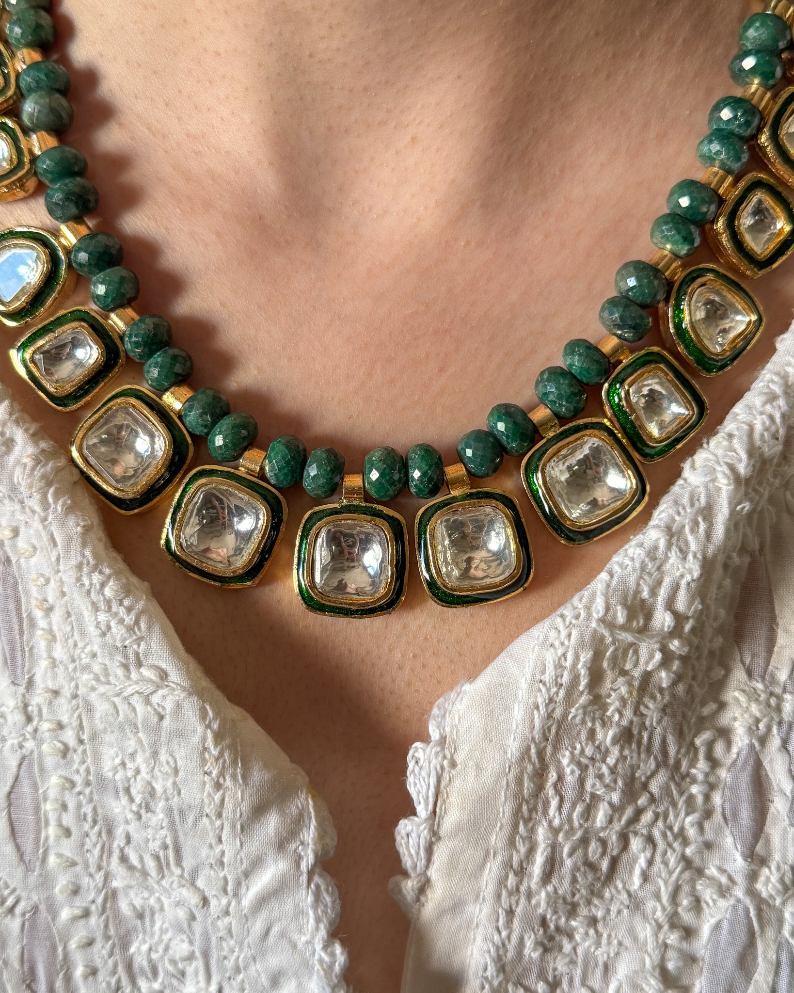 A statement necklace featuring natural green beryls and handcrafted polki tukris with delicate green meena detailing. Each tukri hangs gracefully, creating a piece that’s timeless, festive, and unmistakably ShehNoor.