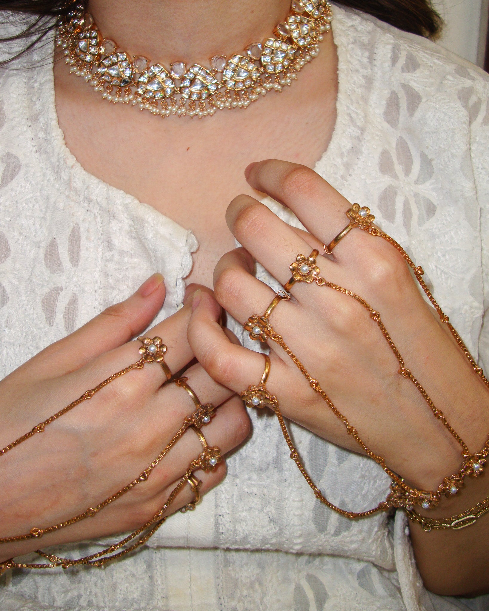 A dainty handmade harness with four floral rings and faux pearl detailing. Both wrist closure and rings are adjustable: one size fits all