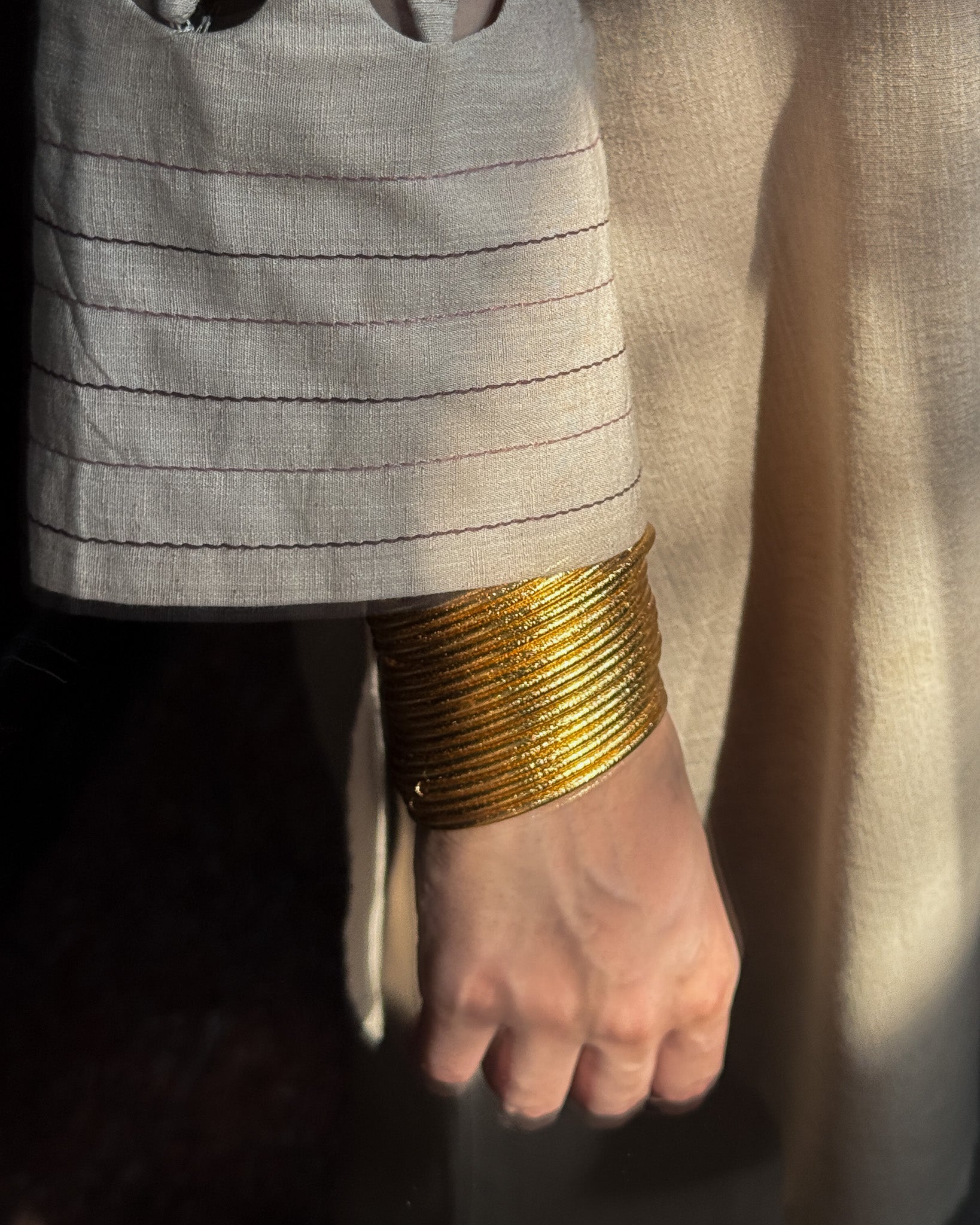 The bangles come as a set of six, handcrafted in textured gold plated brass