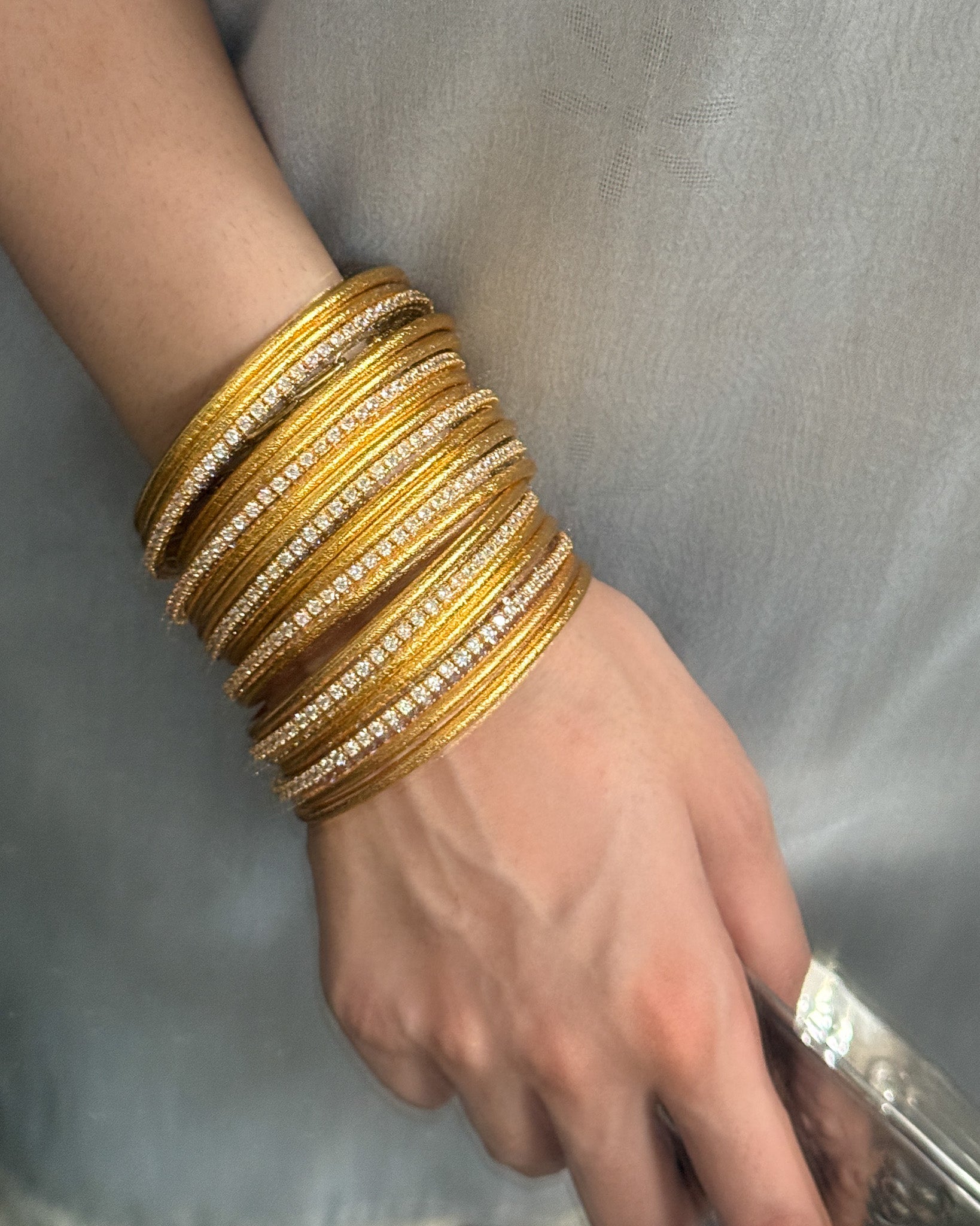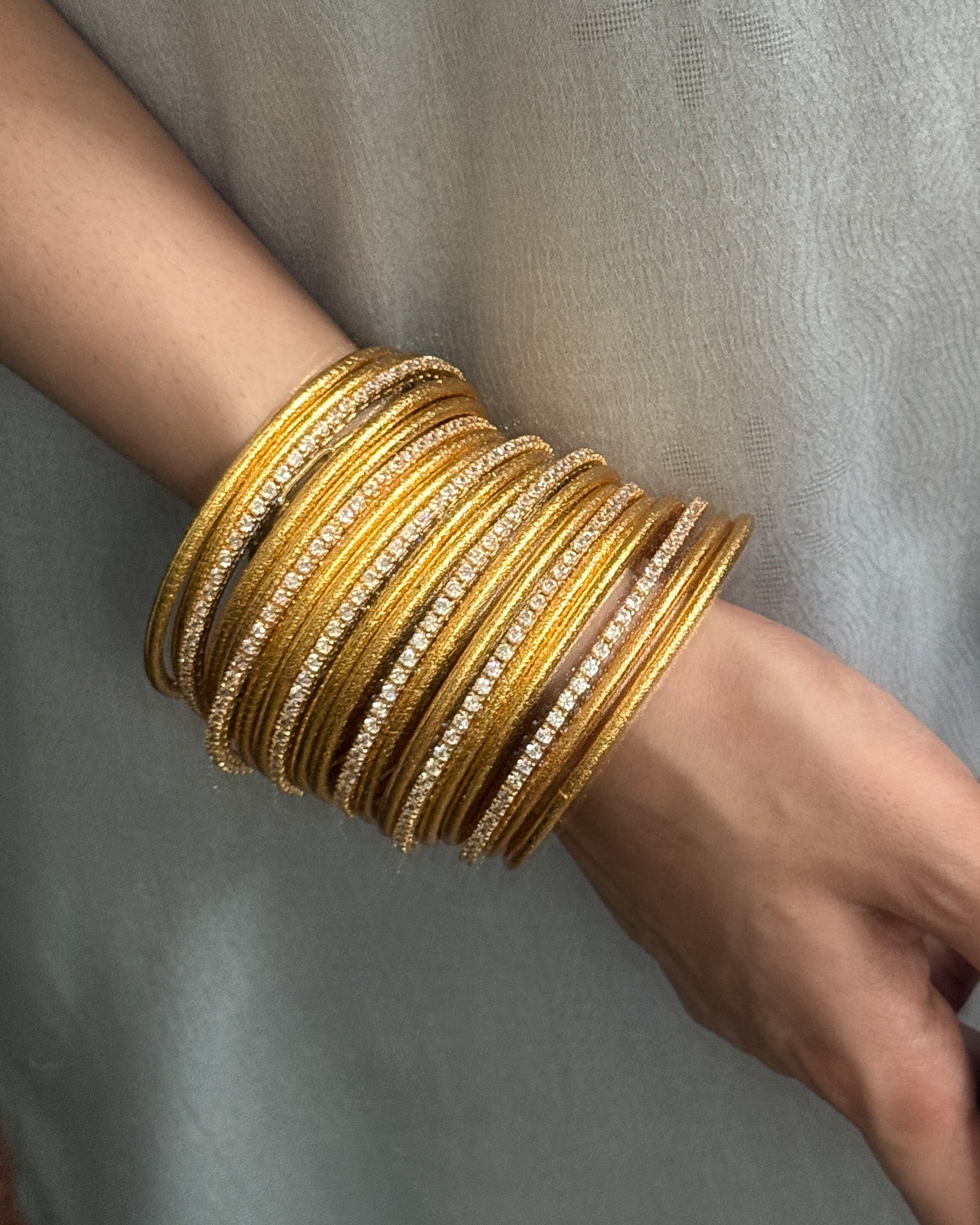 Zircon encrusted churris, handcrafted in gold-plated brass, best paired with our Zari churris. The churris are sold in pairs (two).